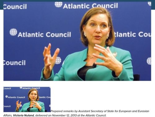 Next, pic­tured below, you will see Vic­to­ria Nuland, the archi­tect of the 2014 Ukrain­ian regime-change oper­a­tion even­tu­al­ly pre­cip­i­tat­ing todays war with Rus­sia. Here she is address­ing the Atlantic Coun­cil less than three months pri­or to the coup. Regime-change oper­a­tions are not autho­rized under the US Con­sti­tu­tion and vio­late inter­na­tion­al law. They do it any­way.
